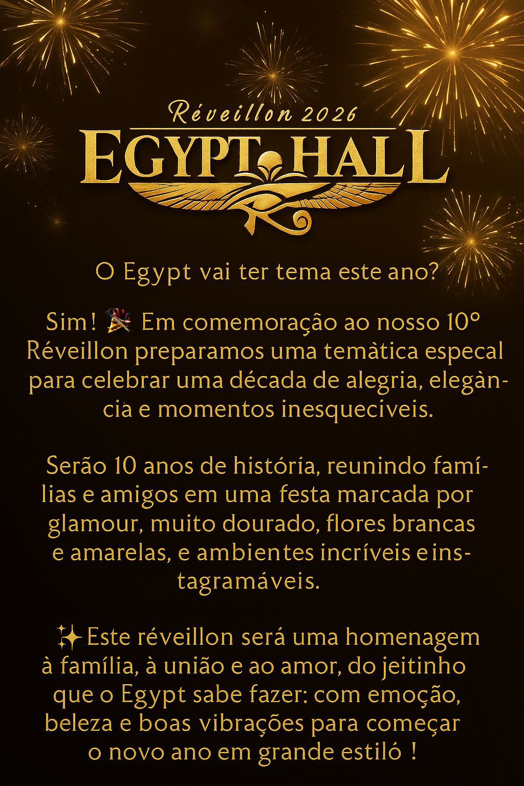 Uberlândia já tem endereço certo para dar as boas-vindas a 2026 em grande estilo. O Réveillon Egypt Hall 2026 celebra 10 anos de história do Egypt Hall, consolidado como um dos espaços mais imponentes e sofisticados da região, com uma noite pensada para ser memorável. Reconhecido pela estrutura grandiosa, experiências gastronômicas completas e produções de alto padrão, o evento prepara uma edição histórica, reunindo glamour, emoção e uma programação que atende toda a família. Uma década de celebrações Para marcar o 10º Réveillon, o Egypt Hall apresenta uma temática especial que traduz sua essência: elegância, união e boas energias para